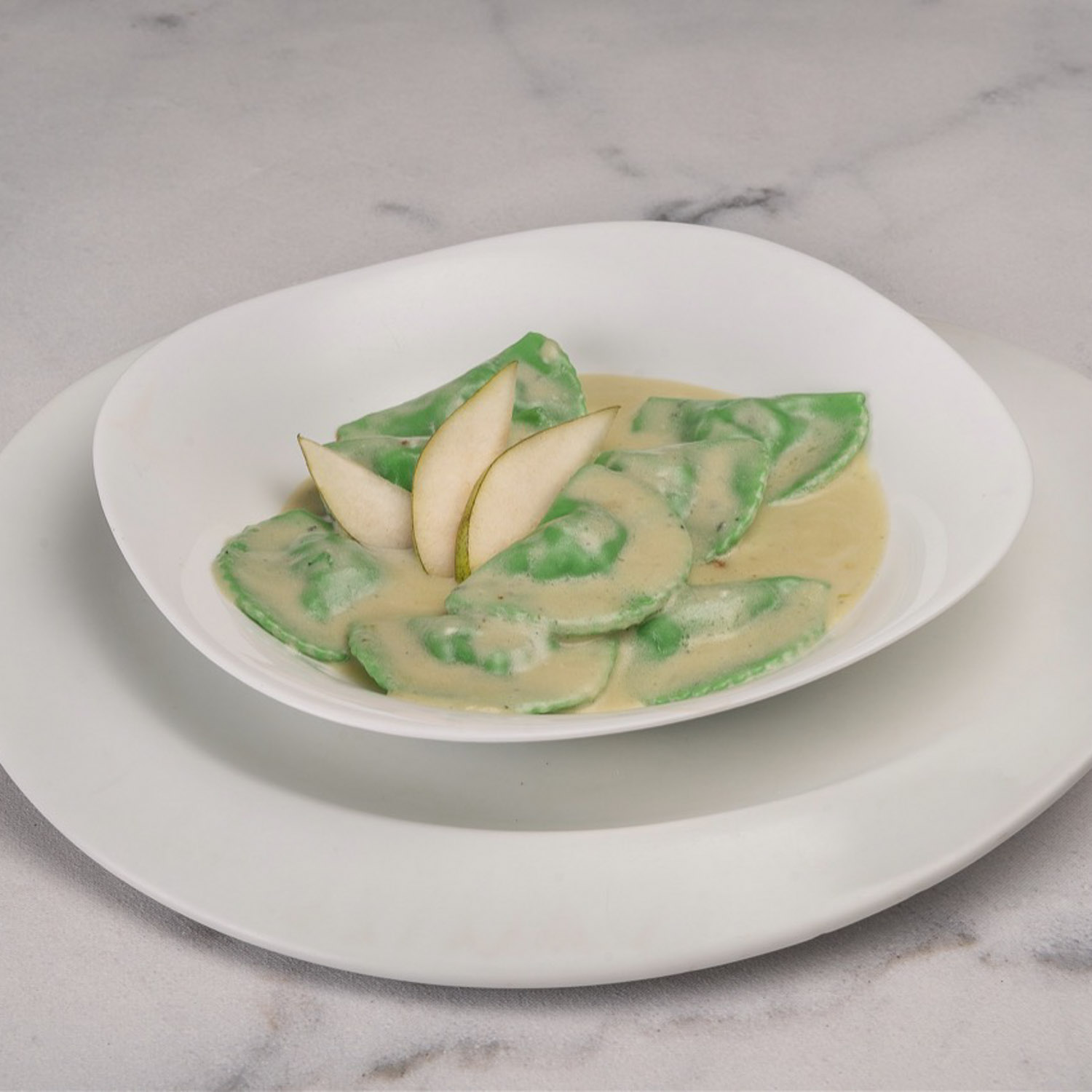 Ravioles rellenos de pera en salsa roquefort.